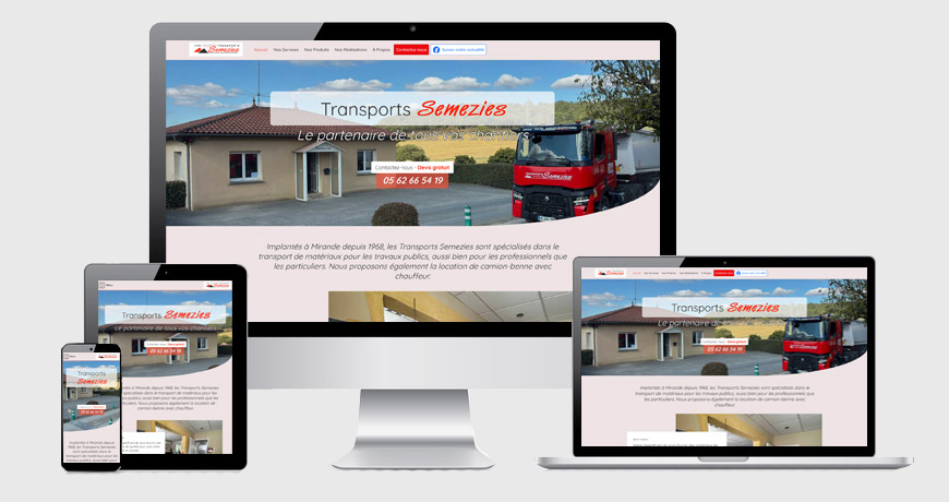 Conception et réalisation du site de la société Sémézies de Mirande (32), spécialisée dans la location de camions benne avec chauffeur et la livraison de matériaux chantier.